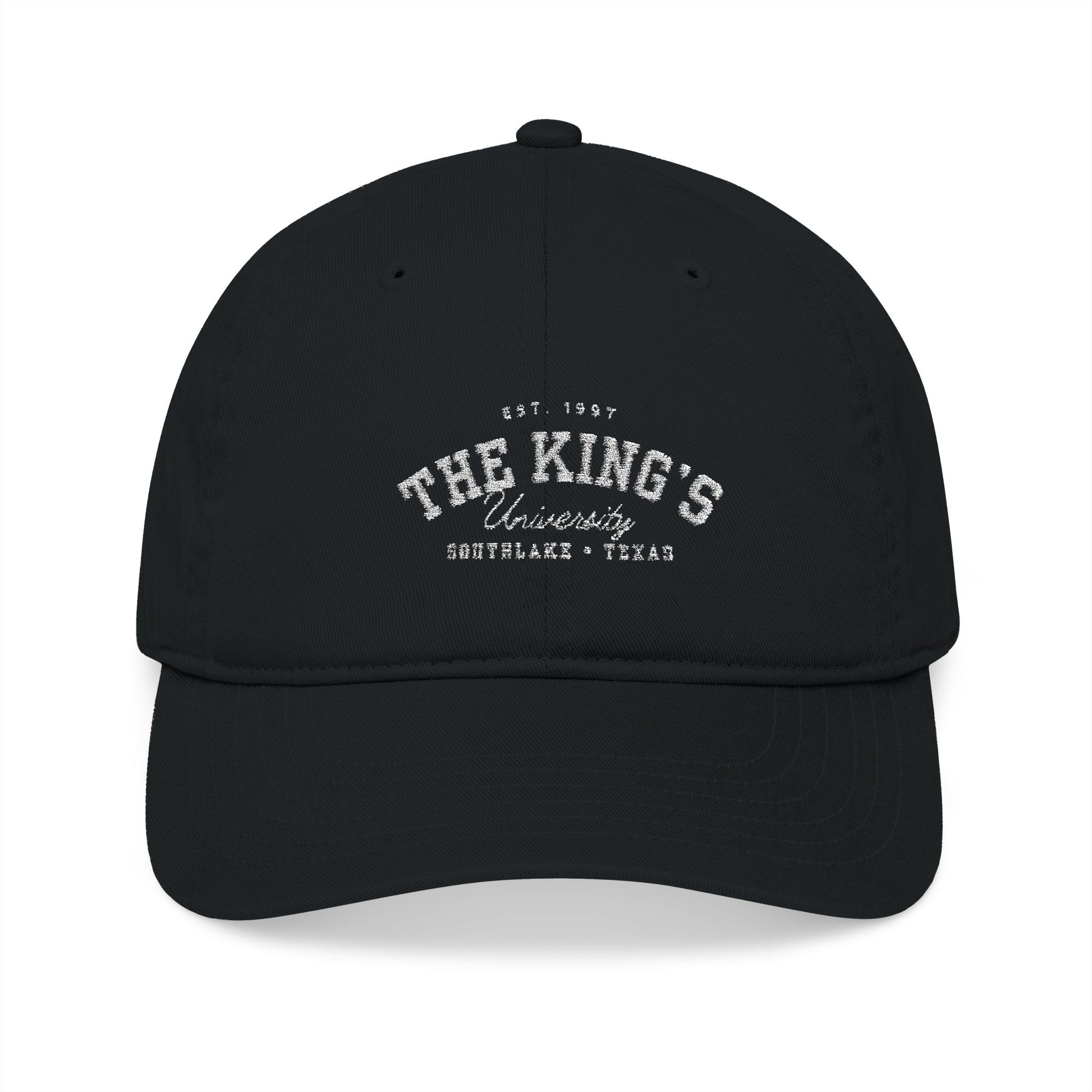 100% organic cotton adjustable baseball cap with white embroidered The King's University design